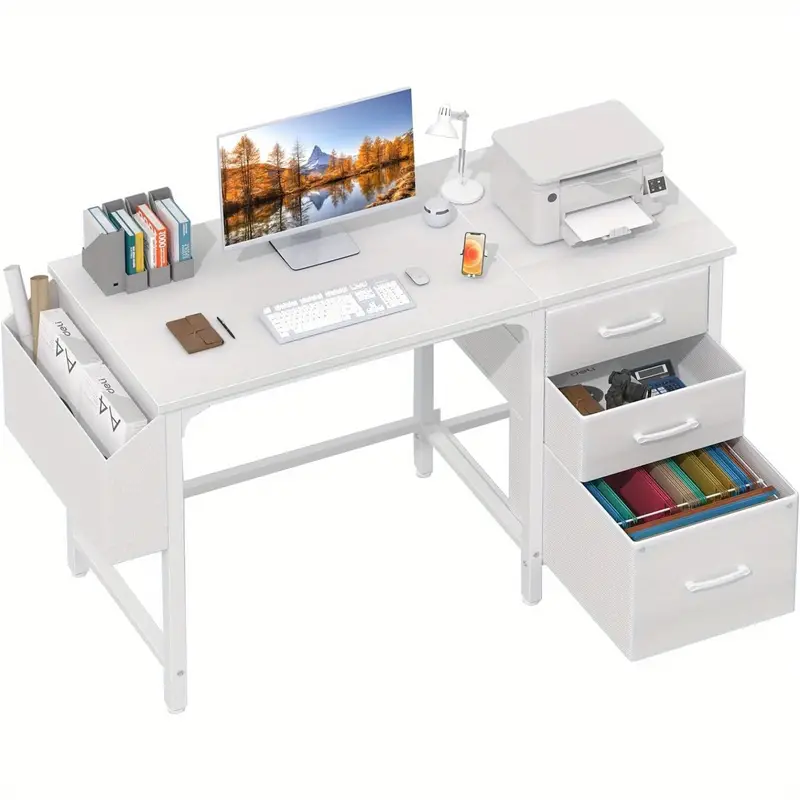 Lufeiya Escritorio de computadora blanco con cajones de archivo, gabinetes de 47 pulgadas, escritorios de oficina en casa con gabinete de archivo de tela para espacios pequeños, mesas de escritura modernas para PC, blanco