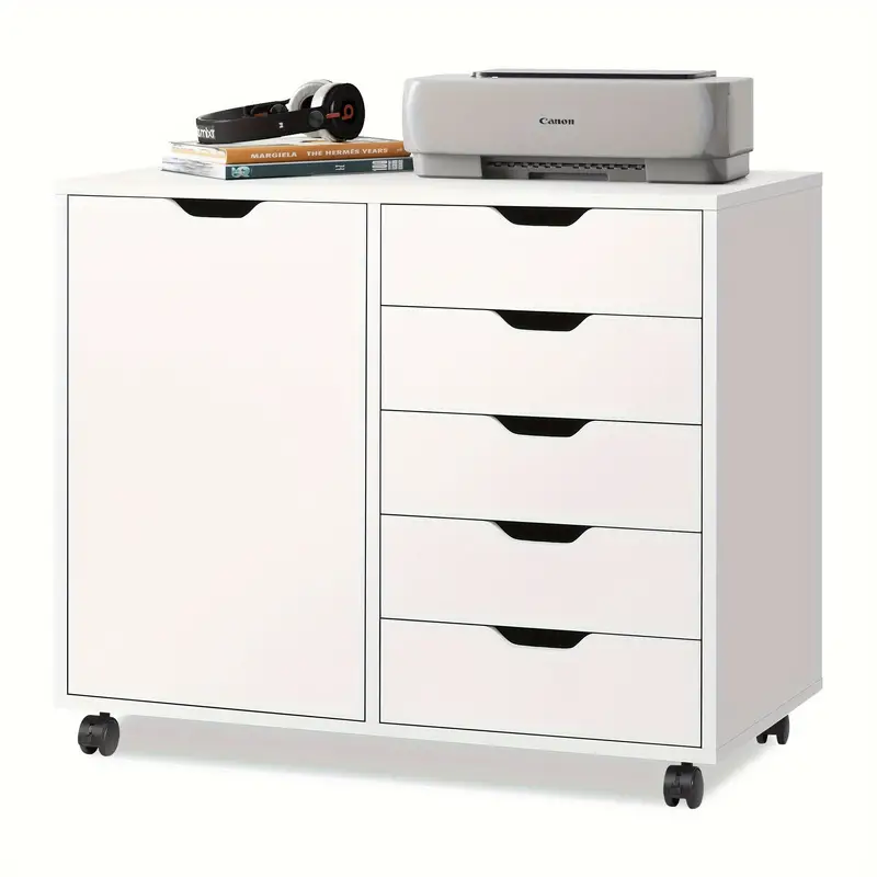 DEVAISE Cómoda de madera con 5 cajones y puerta, gabinete de almacenamiento móvil, soporte para impresora para oficina en casa