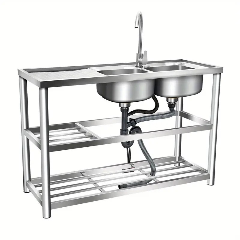Fregadero comercial de cocina con 2 cubetas, fregadero utilitario de 2 compartimentos con 2 escurridores y 2 estantes, fregadero de cocina independiente de acero inoxidable 304