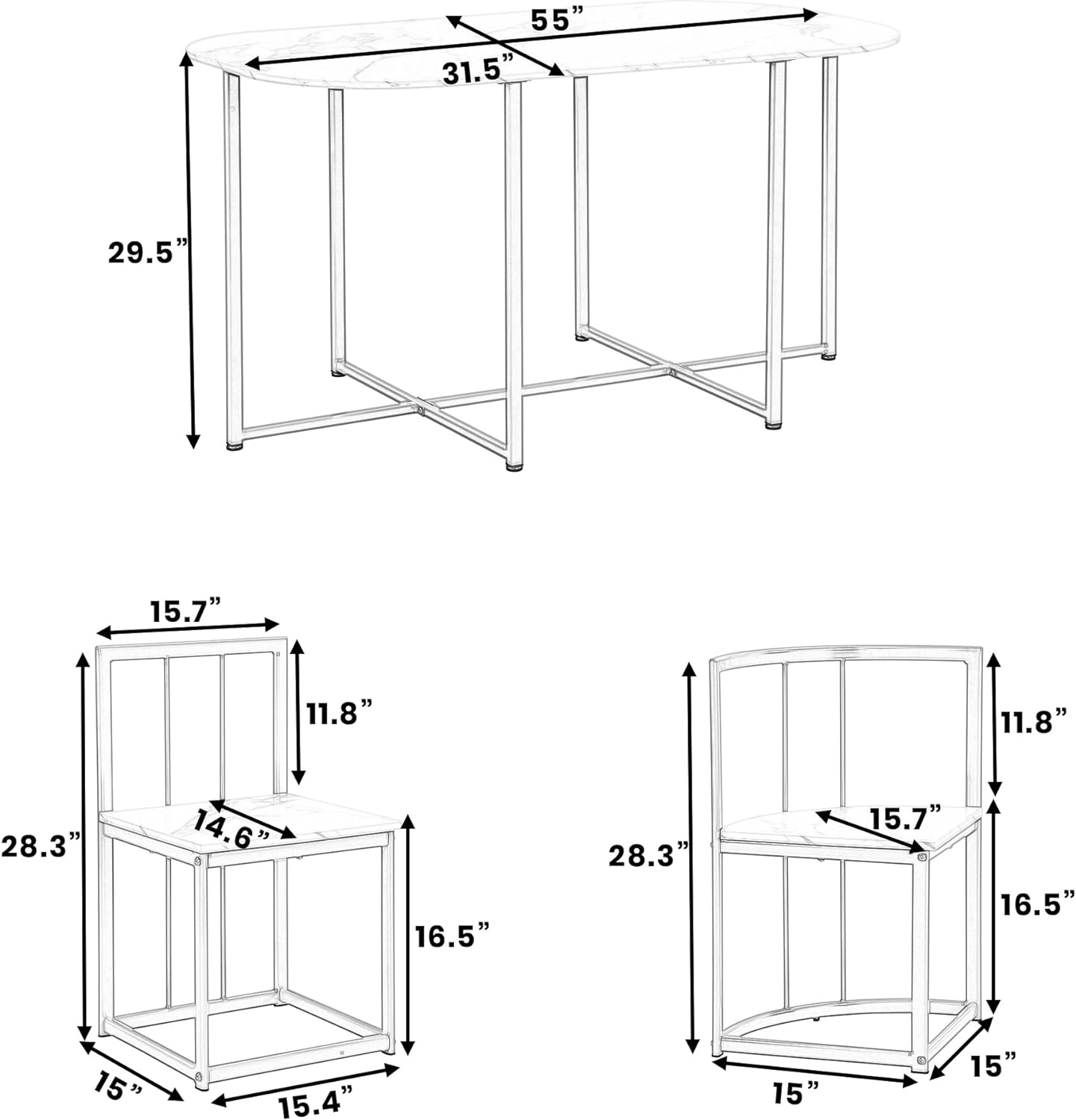- Dimensiones: mesa: 55 x 31.5 x 29.5 pulgadas (largo x ancho x alto), grosor de la mesa: 1.5 cm, silla central: 15 x 15.4 x 28.3 pulgadas (largo x ancho x alto), silla triangular: 15 x 15 x 28.3 pulgadas (largo x ancho x alto), asiento a piso: 16.2 pulgadas. 9 cm cm cm Se envía en 2 cajas.