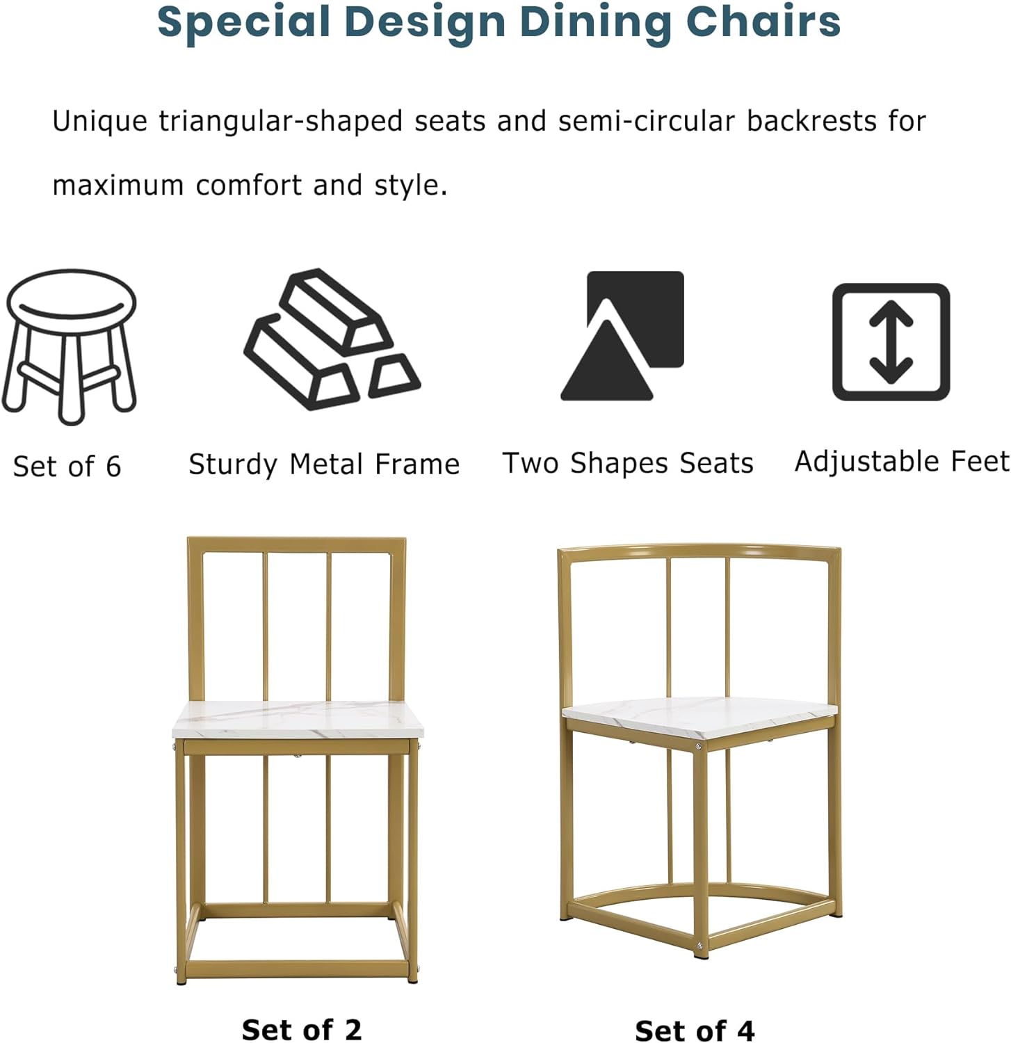 - Elegantes sillas de comedor: cada silla de este juego cuenta con un asiento único de forma triangular y respaldo semicircular, proporcionando la máxima comodidad y estilo. Con un diseño elegante y moderno, estas sillas complementan perfectamente el aspecto contemporáneo de la mesa, por lo que es ideal para reuniones íntimas o cenas familiares.