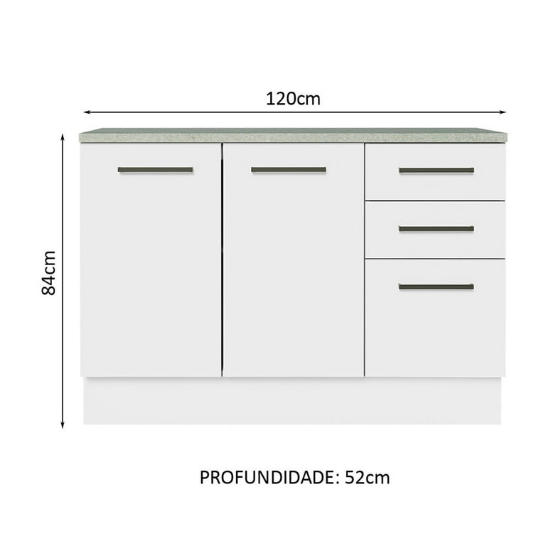 La funcionalidad se ve reforzada por las patas ajustables en PVC, que permiten una fácil nivelación del mueble, y un zócalo removible, que simplifica las tareas de limpieza. Además, incluye una encimera desmontable diseñada para acoger un tarja de 120 cm de ancho por 52 cm de profundidad, proporcionando una integración perfecta y un aprovechamiento máximo del espacio.