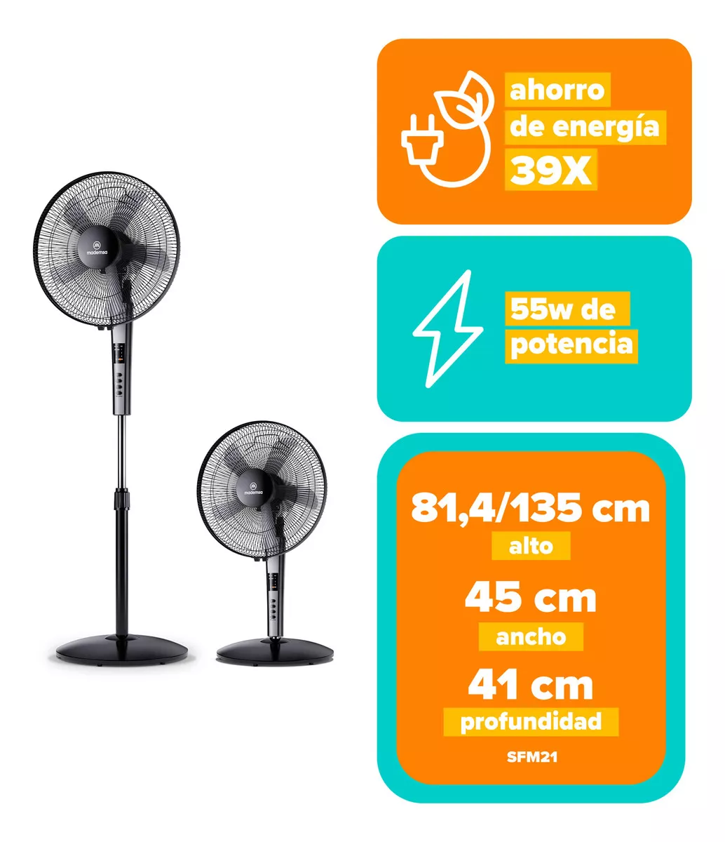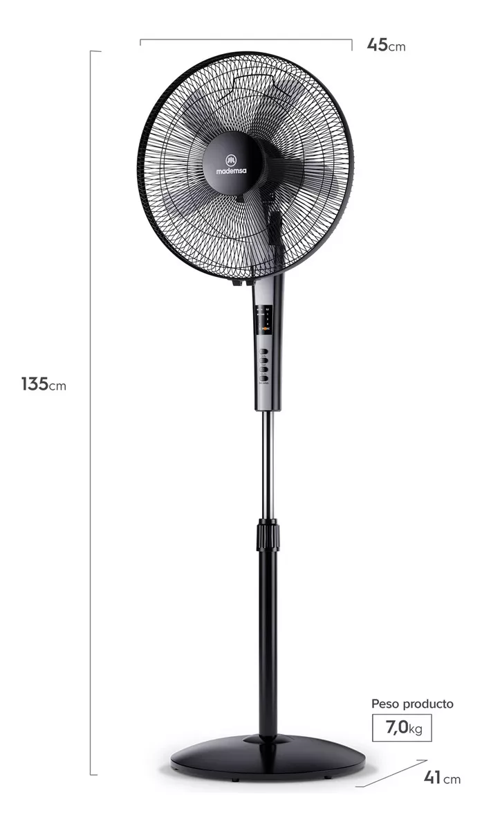 Caractersticas generalesMarcaMademsaModeloSFM21Voltaje220VDimensionesAltura1,35 mProfundidad41 cmAncho45 cmFuncionesCon oscilacinSOtrosPeso7 kgEspecificacionesTipo de ventiladorDe pisoCantidad de velocidades3Incluye control remotoSDuracin del producto4 aosPlazo de repuestos o servicio tcnico4 aosCaractersticas de la estructuraColor de la estructuraNegroColor de las aspasNegroMaterial de las aspasPlsticoCantidad de aspas6Material de la rejillaMetalCon altura ajustableS- Flujo de aire potente: Con 55W, garantiza un ambiente fresco y eficiente.- Ventilador 2 en 1: Se puede regular la altura, usndose como ventilador de mesa o de pedestal.- Funcin timer: Programable hasta 7,5 horas para apagado automtico, reduciendo el consumo de energa.- Control remoto: Permite encender, apagar y programar el ventilador a distancia.- Ajuste de velocidad: Tres niveles de velocidad para adaptar el flujo de aire segn tus preferencias.- Ajuste de direccin de flujo: Inclinacin vertical en 4 posiciones para una mejor distribucin del aire.- Oscilacin horizontal: Movimiento de 90 para una distribucin uniforme del aire en toda la habitacin.Caractersticas:- Potencia de 55W: Eficiencia energtica, reduciendo hasta 39 veces el consumo en comparacin con un AC de 9000 BTU/h.- Dimetro de 40,6 cm de las aspas: Proporciona un rendimiento ptimo del flujo de aire.- Sistema oscilante: Asegura una distribucin amplia y uniforme del aire hacia los lados.- Rejilla extrable: Facilita la limpieza.- Aspas transparentes: Diseo discreto y moderno para el hogar.Especificaciones:- Alto: 81,4 / 135 cm- Ancho: 45 cm- Profundidad: 41 cm- Peso: 7,0 kg- Material: Plstico- Giratorio / Oscilacin: S- Time: S- N de velocidad: 3