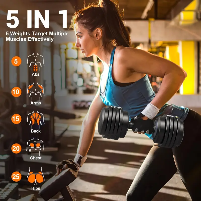 Entrenamiento Corporal Integral: Con una capacidad de ajuste de peso de 5 a 25 libras o de 15 a 55 libras, puedes mejorar y fortalecer gradualmente áreas musculares esenciales como el abdomen, los brazos, la espalda, el pecho y las caderas. Este conjunto de mancuernas es lo suficientemente versátil para ayudarte a tonificar y definir todas las partes de tu cuerpo.