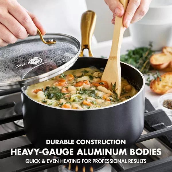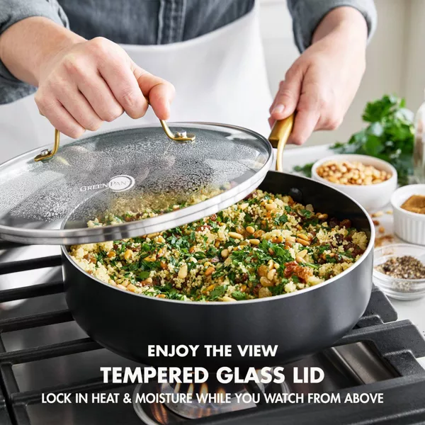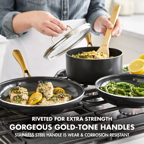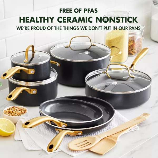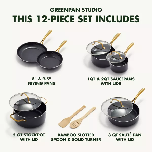 The GreenPan Studio Collection features state-of-the art technology, with an added dash of extra-stylish design. (Note: the stunning gold-tone handles, which have a corrosion-resistant finish.) Throughout the line, the ceramic nonstick coating boasts diamond-enhanced layers for added durability. And the heavy-gauge aluminum bodies deliver excellent heat conduction. As with all of our cookware, this line is free of PFAS, PFOA, lead, and cadmium. Whether you're just starting out in the kitchen or tackling complicated dishes, this 12-piece set will have everything you need—including glass lids and two types of bamboo utensils.