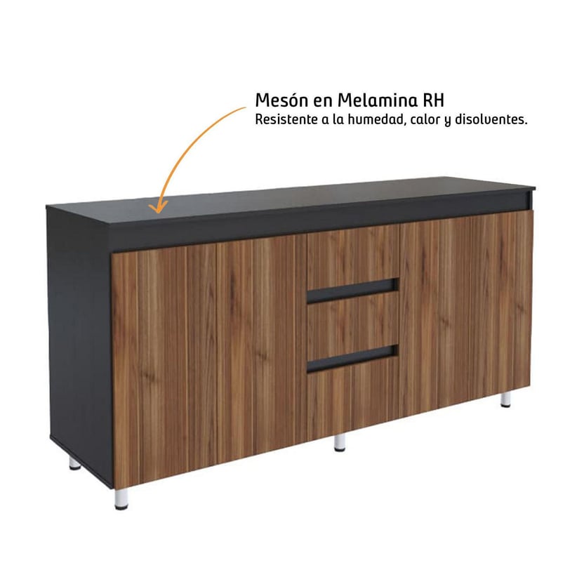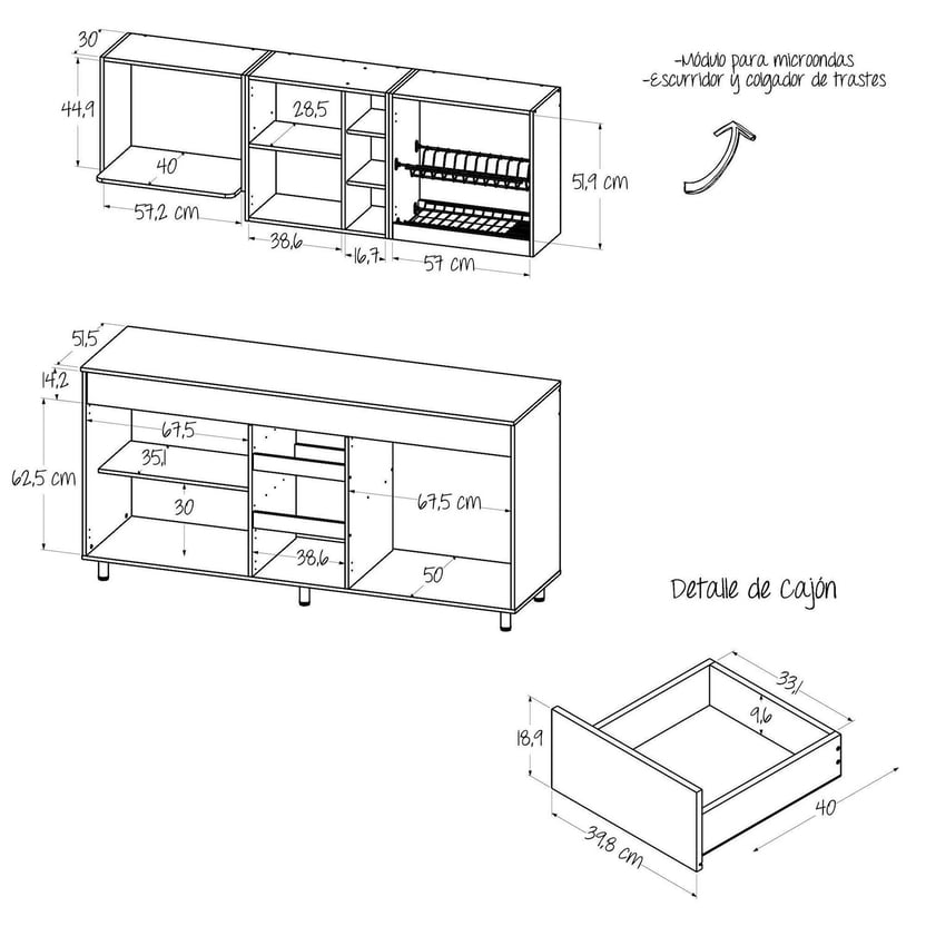 La Cocina Integral Arkala 1.8m tiene módulo superior con espacio para horno microondas, 3 puertas abatibles sin manija, juego de locero y vajillero, 2 espacios cerrados y 3 abiertos para almacenamiento. El módulo inferior tiene mesón en aglomerado RH (Resistente a la Humedad), 2 cajones sin manija, 5 puertas abatibles y 4 espacios cerrados para almacenamiento. La cocina se puede armar derecha o izquierda según tus necesidades. Medidas Módulo Superior: ancho 180cm x alto 60.5cm x profundidad 40cm. Medidas Módulo Inferior: ancho 180cm x alto 89cm x profundidad 51.5cm.