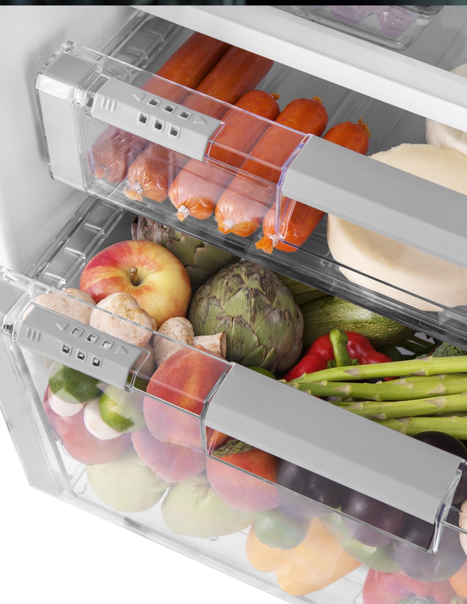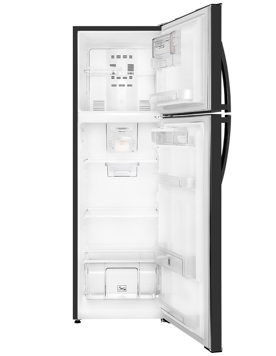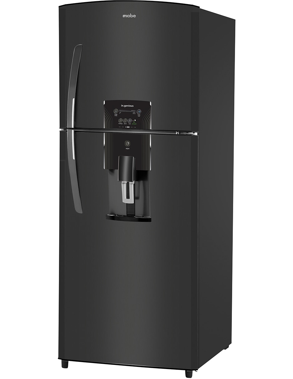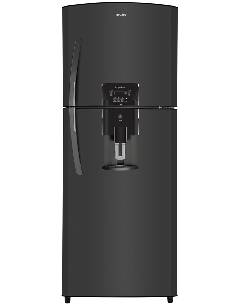 Refrigerador Mabe Top Mount de 11 pies cúbicos negro con display táctil, despachador de agua 2 L, jaladera soft touch, con ahorro de energía, mejor conservación y mayor frescura en los alimentos gracias a la tecnología Home Energy Saver; en enfriador cuenta con 2 parrillas de cristal templado, 2 anaqueles completos en puerta, 1 cajón legumbrero y 1 para carnes frías, huevera y luz LED, en congelador cuenta con 1 parrilla de cristal templado, 2 anaqueles en puerta y desmoldador de hielo