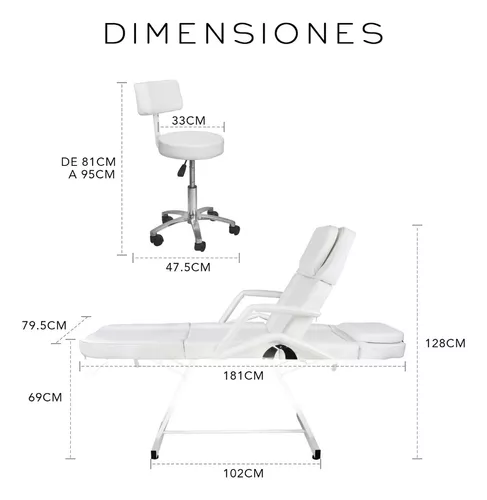 - Dimensiones de la camilla: 70 cm alto x 50 cm alto respaldo x 50 cm ancho x 183 cm largo en modo cama.