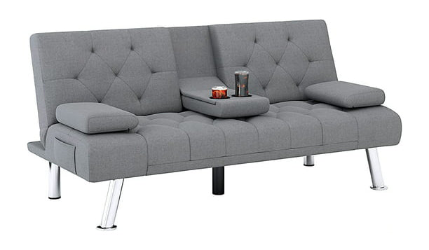 DISEÑO DE ORGANIZACIÓN CONVENIENTE: El sofá cama plegable tapizado tiene una mesa desplegable en el medio con 2 portavasos para un espacio conveniente para beber. 2 bolsillos laterales para guardar fácilmente controles remotos, revistas y más. Los 2 reposabrazos se pueden mover libremente y se pueden colocar en cualquier lugar.